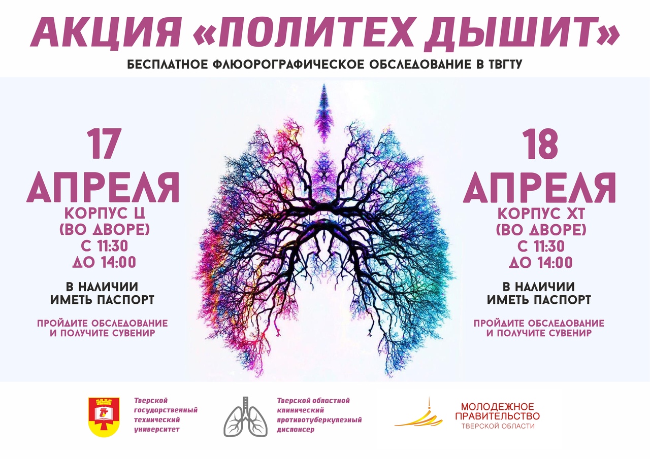 17 и 18 апреля пройдет социально значимая акция "Политех дышит", организаторами которой выступят Тверской государственный технический университет, Молодежное правительство Тверской области и Тверской областной клинический противотуберкулезный диспансер.